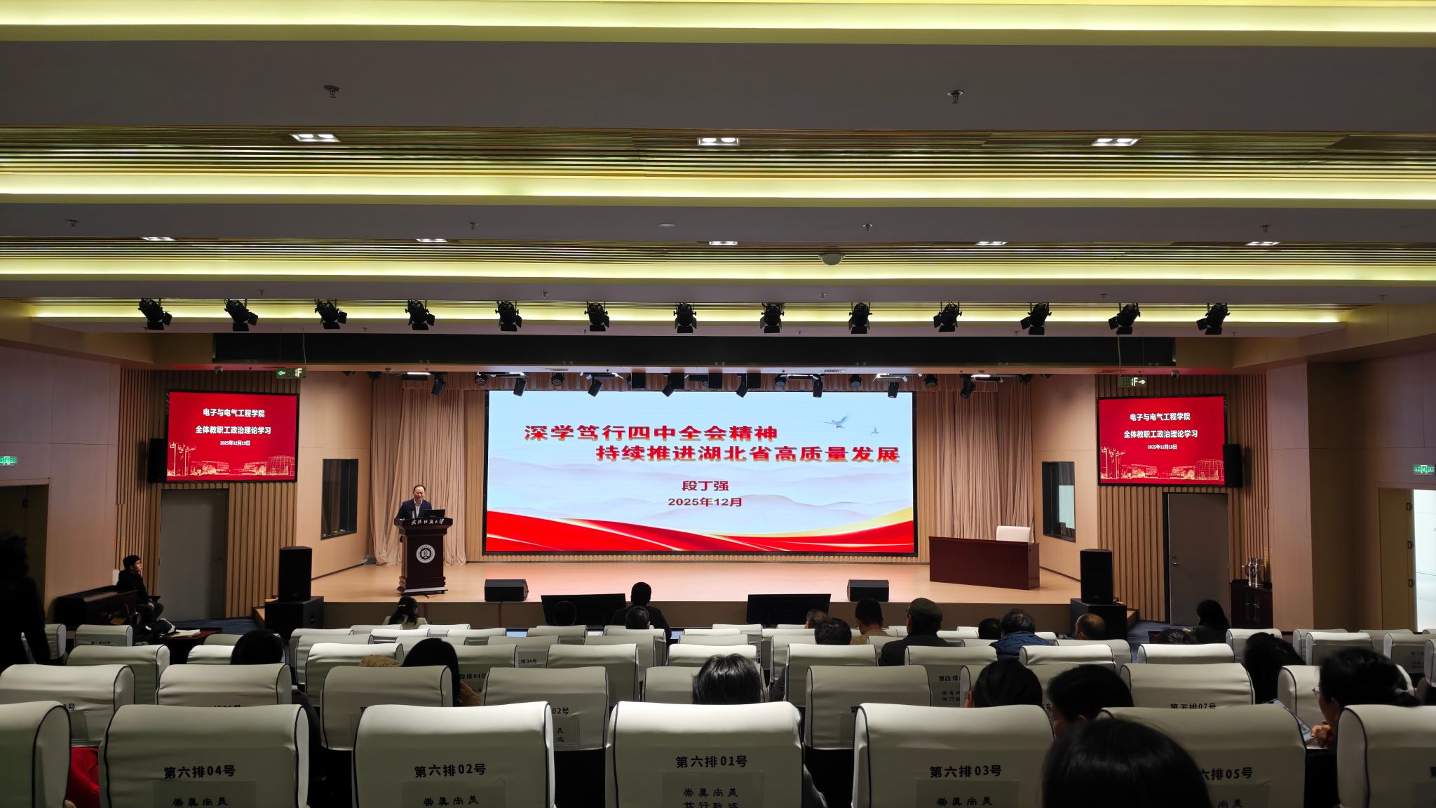 段丁强强调,电子电气学院作为学校工科优势学科,肩负着服务国家战略需求和行业转型升级的重任,应充分发挥学科优势,深度参与湖北省“51020”先进制造业产业集群建设,为湖北“加快建成中部地区崛起重要战略支点”贡献智慧。他鼓励学院全体教职工将个人奋斗融入时代洪流,坚守立德树人初心,勇担“为党育人、为国育才”重任,将党建工作与学科建设、人才培养深度融合,聚焦智能制造、新能源技术等前沿领域,开展高水平科研,在关键核心技术上寻求突破,持续为强国建设输送优秀人才。