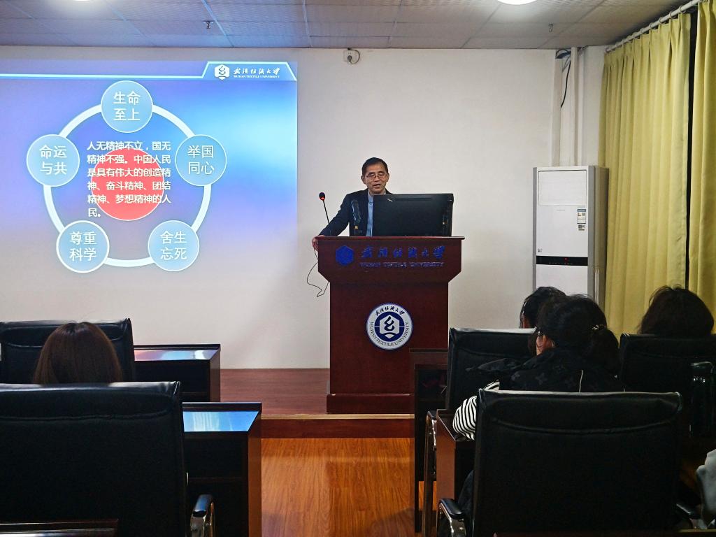 姜明华回顾了新冠肺炎爆发以来,在党的坚强领导下,全国人民众志成城、共克时艰,取得了重大决定性胜利。他用真实数据和一个个典型事例诠释了我国的制度优势,让同学们深刻感悟到“生命至上、举国同心、舍生忘死、尊重科学、命运与共”的伟大抗疫精神。姜明华还结合“武汉纺织大学企业微信”的研发和应用,生动地讲述了学校在疫情期间管理、服务“幕后的故事”,以及全校师生同舟共济、团结互助的感人时刻。