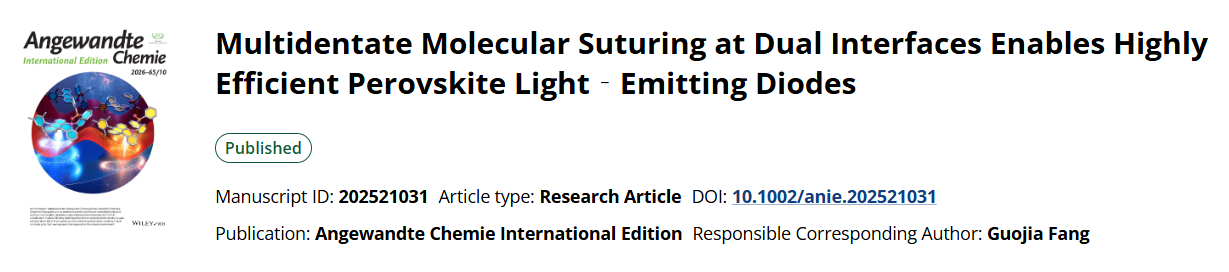 近日,我校电气学院先进能源与未来显示技术团队曹晓娟博士、姚方副教授等人在国际著名期刊《Angewandte Chemie International Edition》上在线发表了题为“Multidentate Molecular Suturing at Dual Interfaces Enables Highly Efficient Perovskite Light-Emitting Diodes”(多齿分子双界面缝合策略实现高效钙钛矿发光二极管)的研究成果(//doi.org/10.1002/anie.202521031)。武汉纺织大学为第一单位,武汉大学及华中农业大学为合作单位,曹晓娟博士及联合培养研究生王璇为论文的共同第一作者,方国家教授、雷红伟副教授、姚方副教授为论文的共同通讯作者。