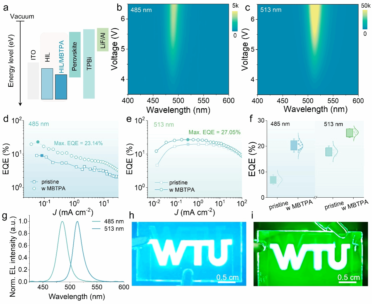 针对上述问题,团队研究人员提出了一种新的“分子缝合”策略,即通过引入多功能配体来同步稳定界面并引导晶体生长的。采用甲基双(2,2,2-三氟乙基)膦酰乙酸酯(MBTPA)多齿配体分子,其中羰基(C=O)和磷氧基(P=O)基团能与钙钛矿中未配位的Pb2+离子形成配位相互作用,有效钝化缺陷态,抑制非辐射复合。与此同时,三氟甲基(-CF3)基团则与空穴注入层建立起稳固的氢键相互作用。这种双官能团设计使得MBTPA分子犹如微观“缝合线”,从两侧分别与钙钛矿和空穴传输层形成化学相互作用,从而将埋藏界面紧密地“缝合”起来。这种双界面相互作用机制优化了能级排列,并引导钙钛矿薄膜形成高质量、低缺陷的晶格结构。最终,经MBTPA修饰的PeLEDs器件实现了波长485 nm和513 nm处的明亮蓝/绿光发射,其峰值外量子效率(EQE)分别达到23.14%和27.05%。这种“分子缝合”策略为同时调控界面化学性质和结晶过程提供了一条有效途径,展现了其在未来显示和照明领域广阔的应用前景。