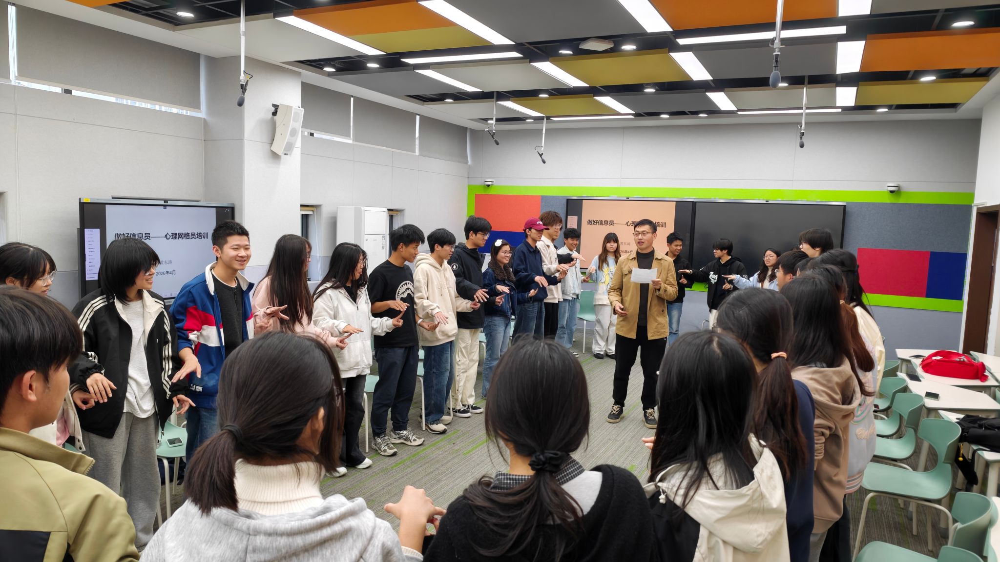 在阳光校区9栋智慧教室举办心理网格员培训暨2026年春季学期心理健康团体辅导活动。本次培训特邀湖北大学学生心理健康教育与咨询中心黄东涛老师担任主讲人,学院各专业共三十余名学生骨干参与活动,涵盖班委、寝室长、入党积极分子等学生群体。