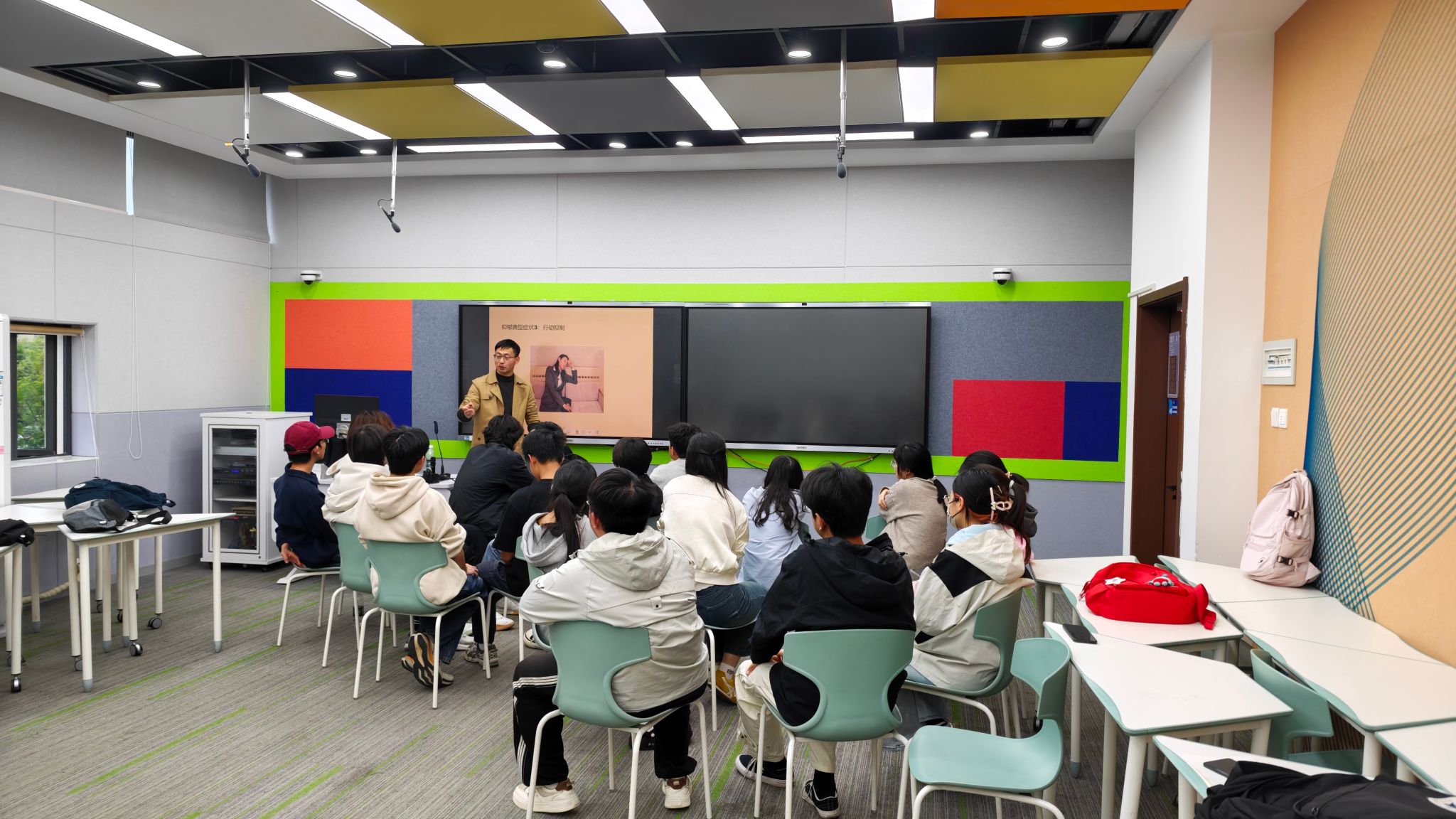 在主题分享环节,黄东涛系统介绍了情绪低落、思维迟缓、行动抑制等抑郁症的典型临床特征,结合生动的真实案例与现场即兴情景模拟,帮助同学们掌握心理异常的初步识别方法。他特别强调,当发现身边同学遇到心理困境时,要第一时间给予鼓励、关心与耐心陪伴,传递正向支持力量,善意引导其前往专业心理咨询渠道寻求帮助;同时要注意避免随意给身边同学贴标签,更不能进行非专业的自我诊断或对他人状况盲目判定。